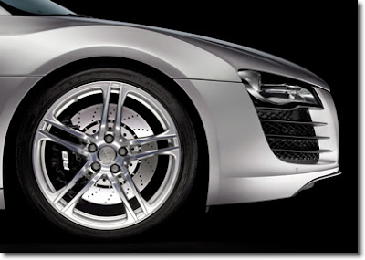 The Audi R8 is fitted with 6-arm 18-inch wheels as standard, and can optionally be ordered with 19-inch wheels. The 235/40 size tyres at the front and up to 285/35 at the rear provide the necessary road-holding. The mid-engined sports car's long wheelbase and extremely low centre of gravity ensure that it always retains maximum stability.